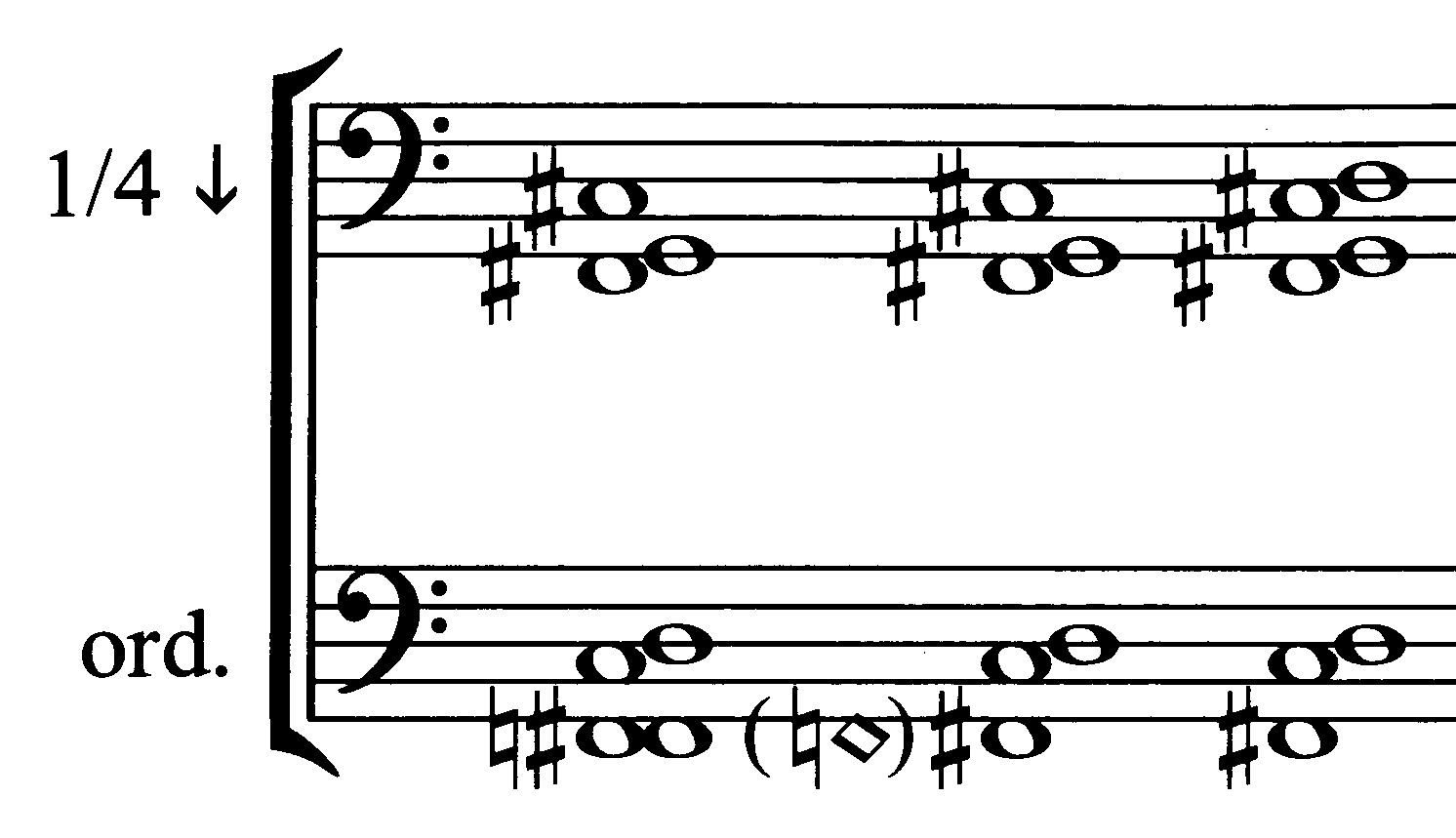 La partition de l’Hommage à György Ligeti comporte 160 accords écrits en rondes ; il faut se référer aux notes d’exécution pour comprendre les actions que doit faire le pianiste. Les pédales forte de chaque piano sont appuyées pendant toute la pièce permettant à l’ensemble des cordes de résonner lorsque chaque accord est répété fortissimo dans une pulsation constante et palpitante. L’instrumentiste peut choisir le temps qu’il souhaite passer sur chaque accord. Les transitions entre les accords sont faites par crescendos et diminuendos. Les notes nouvelles apparaissant progressivement « aussi imperceptiblement que possible » et les notes abandonnées disparaissant tout aussi graduellement. La simplicité apparente de la partition illustrée par les rondes de l’exemple 1a (extrait du début de la page 3 de la pièce) produit un résultat sonore étonnamment riche. Dans sa préface à la partition, Haas présente un exemple de réalisation entièrement notée d’un passage, ménageant les transitions entre les accords tandis que les notes individuelles apparaissent ou disparaissent en fondu enchaîné (exemple 1b).