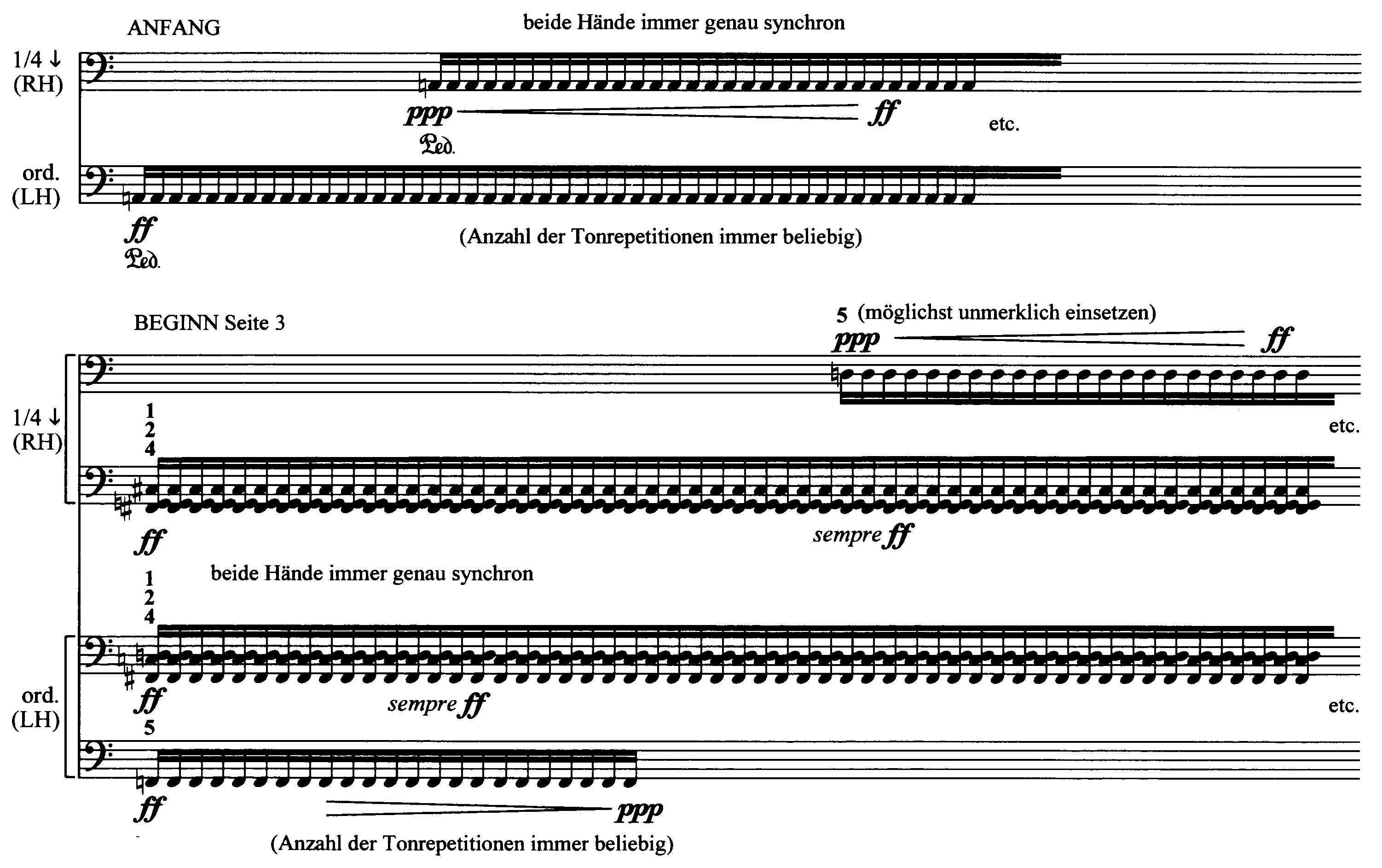 Les harmoniques et les résonances tourbillonnantes occasionnées par le martèlement de ces accords dans le registre grave créent un environnement sonore beaucoup plus complexe et varié que ne le suggère la notation simple de la pièce. Tout comme dans la musique de Scelsi, l’intense concentration sur une sonorité tenue et répétée permet une sorte « d’écoute intérieure » du son – d’après la musicologue Lisa Farthofer, cette « écoute intérieure » (Hineinhören) « ouvre un monde regorgeant d’harmoniques, de battements, de micro-intervalles, un monde sonore situé hors des douze demi-tons tempérés, où un microcosme musical peut s’épanouir et devenir microcosme sonore3 ».