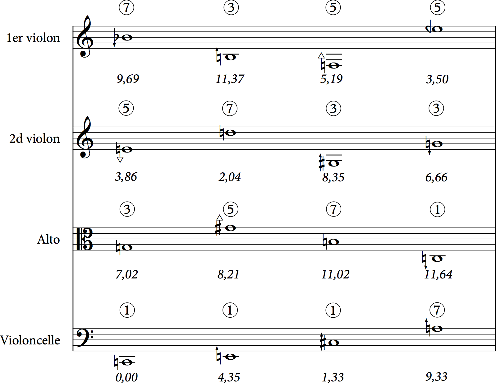 Exemple 2 : Accord des cordes à vide de chaque instrument du Quatuor à cordes n°1 de Haas afin de produire quatre accords de septième de dominante en intonation juste. Les chiffres encerclés représentent la position de chaque note dans la série harmonique, l'accord de chaque hauteur étant indiqué en demi-tons au-dessus de do.